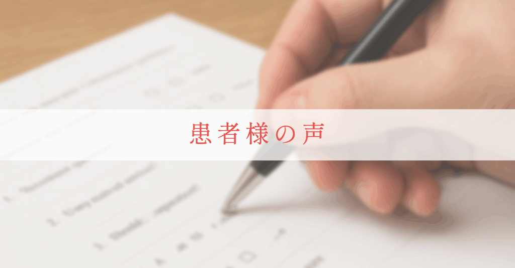 R2.6月の任意の1週間に当クリニックの患者様にアンケートを実施させていただきました。 「患者様の声」はご批判・ご指摘を含め、すべてそのまま掲載しております。 これまでにいただいたご意見に基づき、エアコンのグレードアップ、ウォーターサーバーの設置、トイレの音姫の設置、さらに今回、HPの修正に伴って初診の方のWeb予約を可能にするなどの改善を行っております。また、医師や事務員自身も自らのあり方を振り返り、さらに安心して来院いただけるように心がけております。